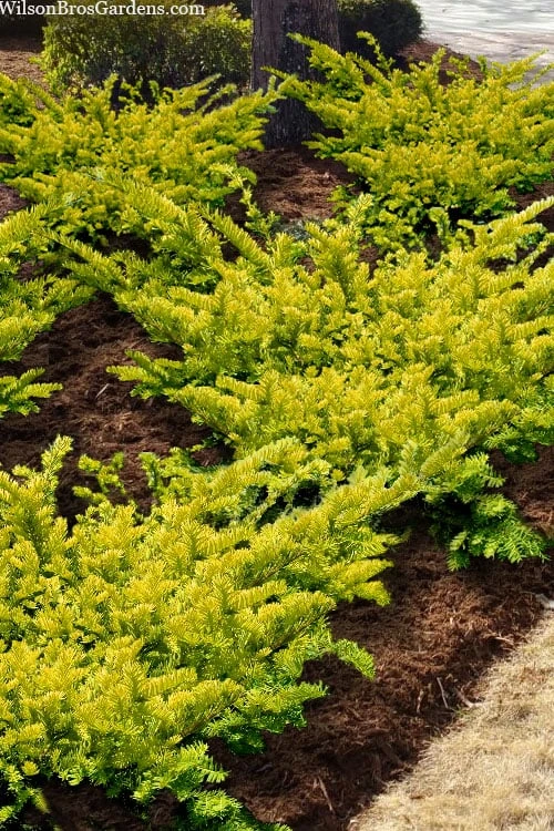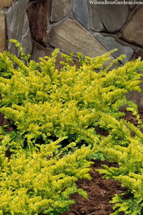 Growing 3.5 to 7 feet tall and 6 to 10 feet wide depending on pruning, the Sunburst Yew is versatile evergreen ideal for use as a specimen, in groupings, or as a natural or clipped hedge. An excellent shrub for home foundation plantings. Looks especially nice around garden ponds or in rock gardens. A fine addition to Asian gardens, rock gardens, yellow theme gardens, tropical look gardens, and conifer gardens.